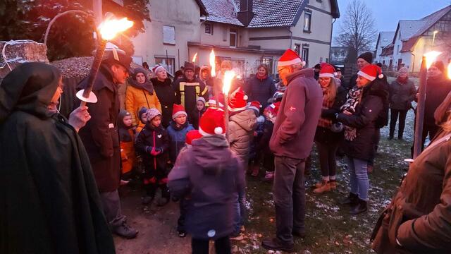 Mit dem Stundenschlag der St.Georg-Kapelle um 16 Uhr begann das Mitmach-Märchen. Der Hutmann (Heiko Gnoth) und seine Helfe-Elfen (Eva Foss/Almuth Voges) hatten keine Mühe, genügend kleine und große Wichtel für das gut 50-minütige Abenteuer zu gewinnen. Ausgestattet mit den im Gotteshaus versteckten Hinweis-Briefen ging es zur Feuerstelle des Köhlers (Siegbert Voges). Aus dieser wurden unter tatkräftiger Unterstützung der Wichtel Goldstücke gewonnen. Durch die fackelhelle Bäckergasse führte der Weg zum verwunschenem Tor. Die Goldstücke mussten dort zu einem Goldbogen zusammen gefügt werden. Als sich darauf hin die Pforte öffnete, wurde die Hütte (Geräteschuppen des Feuerwehrhauses) der Waldfee mit energiesparenden LED-Lichterketten erleuchtet. Die fantasievoll verkleidete Waldfee (Natalie Lüders) verzauberte die jungen und alten Zuhörer mit einer Geschichte (Text Natalie Lüders) über einen im Wald lebenden Wichtel, seiner Familie und den dortigen verschiedenen Tieren. Nach dem Ende der Geschichte erschien ein leuchtendes (Wunderkerzen) Einhorn und zeigte den Weg durch die geöffnete Hecke entlang des erleuchteten Weges zum erhellten Stein (Gedenkfindling 900 Jahre Evern).